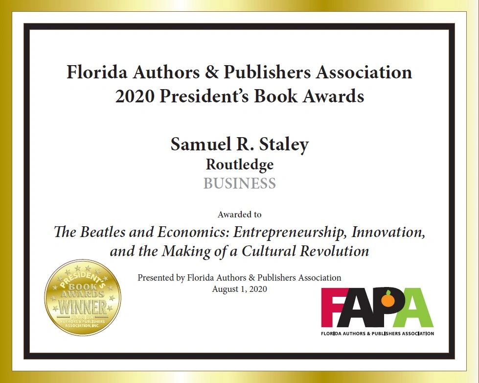 “Sam Staley’s new book does something unique: It explains core principles of cultural entrepreneurship, not by statistical analysis (as in the research literature) or by sketchy anecdotes, but by a sustained, detailed analysis of a team of cultural entrepreneurs, namely The Beatles. As such, it fills an important gap in modern writing on cultural economics and entrepreneurship. The book is extremely well-written, and although it makes use of much economics and management theory it is highly accessible.”